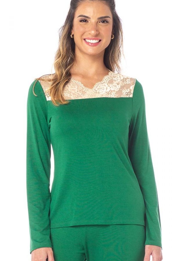 Due to its fabrication in viscolycra, this American-Style Set with lace is super comfortable to touch while wearing, even though it’s a sleepwear. The off-white fillet is present in the detail of the collar and all over the front, giving an elegant contrast. The blouse’s closure system is made by custom buttons, giving the piece a charm and guaranteeing exclusivity.