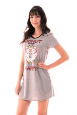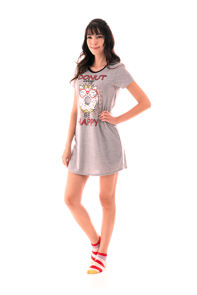 Nightdress made of soft knit, perfect for a great night’s sleep. With wide modeling, round cutout with contrasting mesh, sleeves and front print of donut with glitter application, our model promises to bring comfort and a lot of charm to your night of sleep